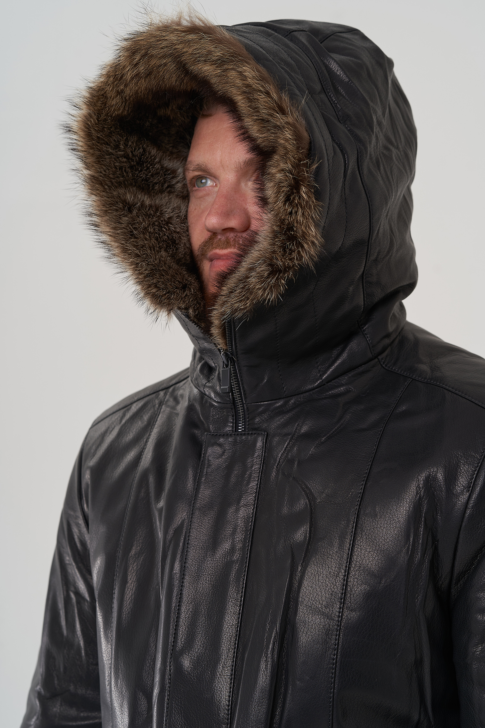 Крой воротника - капюшон, отделка - енот