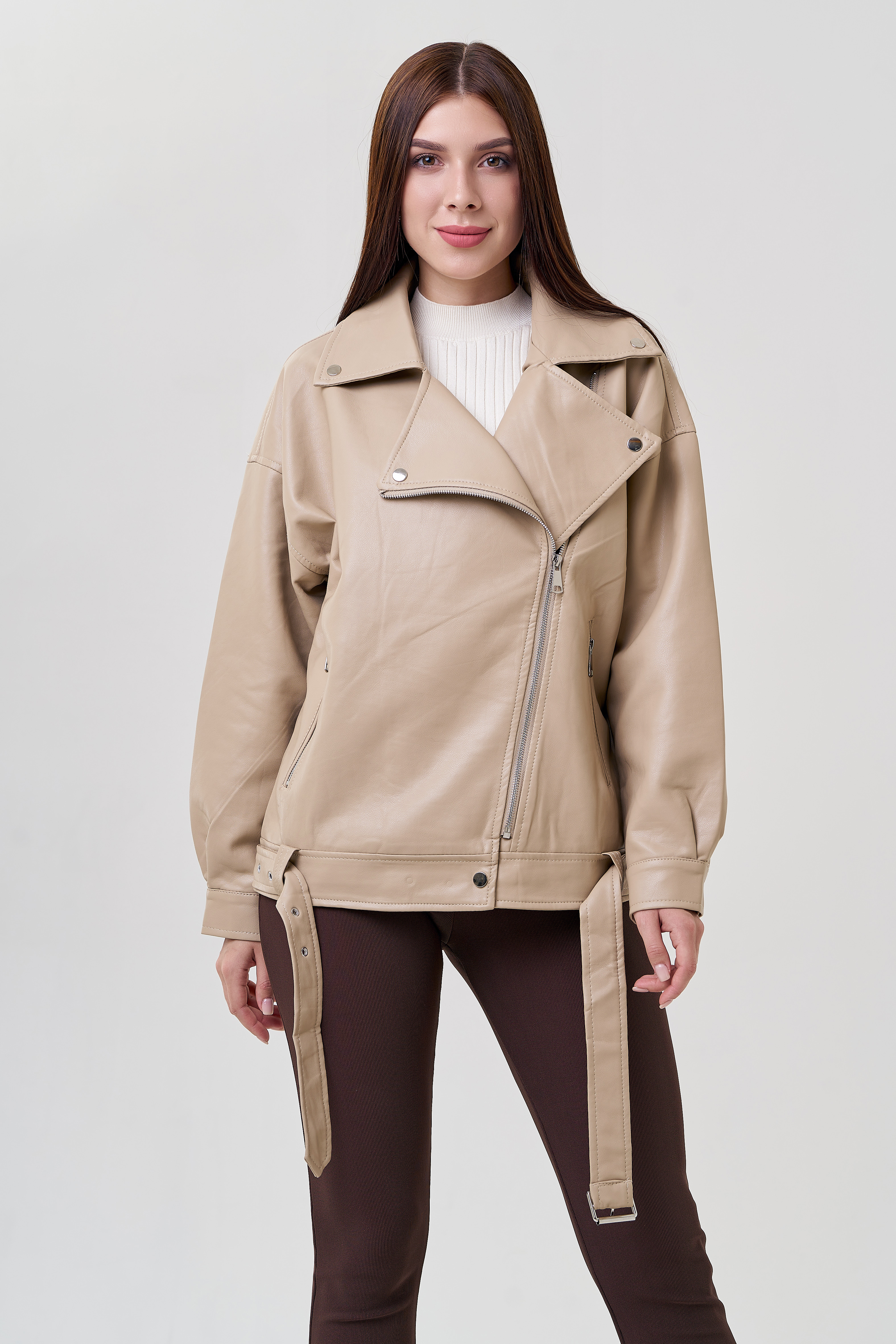 Бежевая куртка в стиле оверсайз точно попадет вам в сердце! Светло-бежевый цвет позволит подбирать к куртке разные образы. Материал эко кожи устойчив к холодам и повреждениям. Модель застегивается на молнию и кнопки. Имеется ремень и карманы на молнии. Рукава с манжетами на кнопках. Фасон оверсайз и спущенные плечи добавят комфорт.